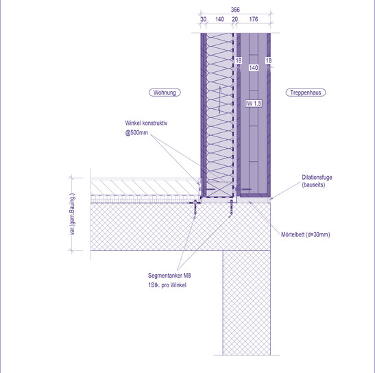 Detail des Übergangs zwischen den massiven Geschossen und dem Holzbau. Die Holzelemente werden auf ein 30 Millimeter dickes Mörtelbett gestellt und mit Segmentankern montiert. Gut ersichtlich ist das gekapselte Treppenhaus aus Brettsperrholzplatten.