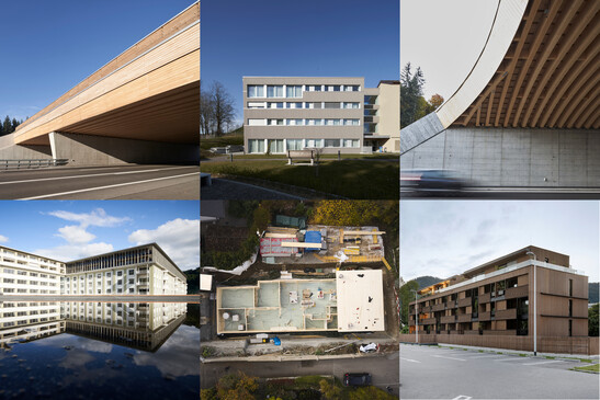 Von oben links im Uhrzeigersinn: Wildtierbrücke Neuenkirch, Spital RFSM in Freiburg, Wildtierbrücke Rynetel, Mehrfamilienhaus in Kufstein (AT), Mehrfamilienhaus mit Keller aus Holz in Thun, Aufstockung Bernapark in Deisswil