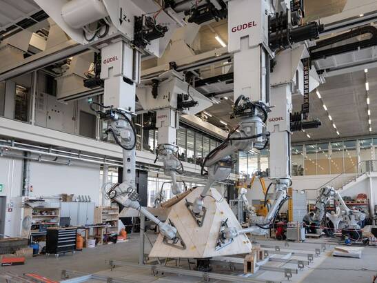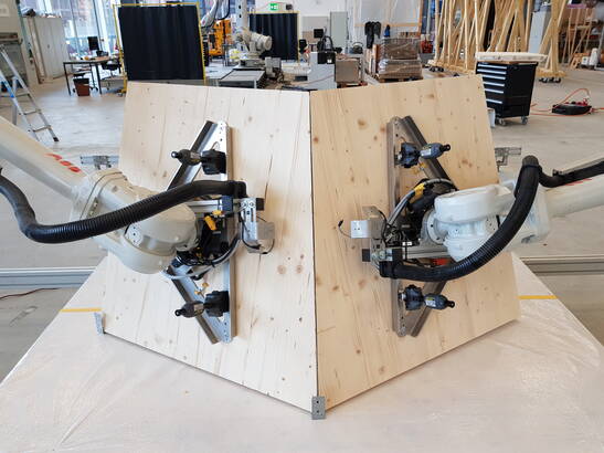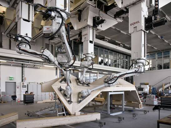 Im Gegensatz zur traditionellen Holzbauweise hat die robotische Fertigung mehrere Vorteile: Zum einen nehmen die Roboter dem Menschen das schwere Heben und das exakte Positionieren ab, zum anderen kann im Montageprozess auf aufwendige, ressourcenintensive Unterkonstruktionen verzichtet werden.
