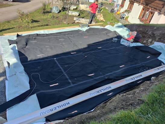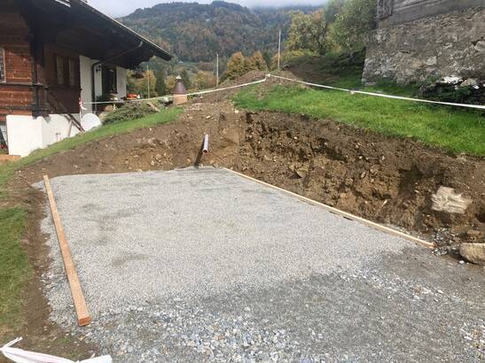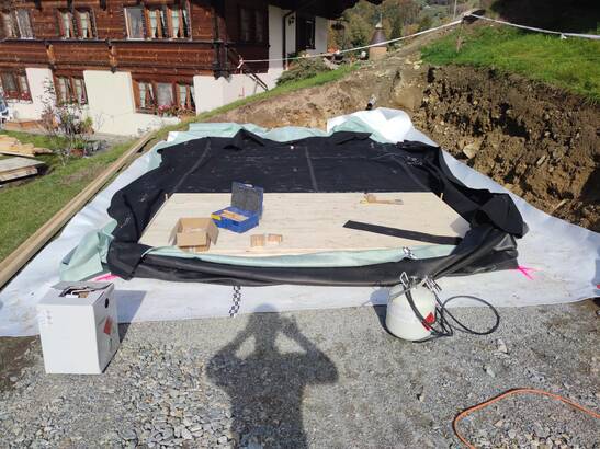 Vor diesem Haus werden neuste Technologien eingesetzt: Mit Brettsperrholzplatten und der TS3-Technologie entstehen Bodenplatte und Sockelwände einer Garage, die dreiseitig im Erdreich steht. Dank mehreren Schutzschichten und einem Feuchtemonitoring kann Holz heute erdberührt eingesetzt werden. Das galt lange als unmöglich. Die Kombination von Innovationen aus den Bereichen Holzbau und Flachdach ermöglicht das neue Einsatzgebiet. Die TS3-Technologie verbindet die CLT-Platten zu einem stabilen Monocoque-Kasten, verschiedene Schutzschichten schützen diesen – genau wie bei einem Flachdach, einfach umgekehrt und im Erdreich verbaut.