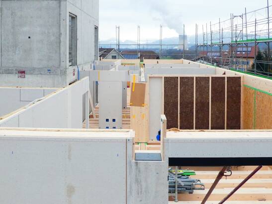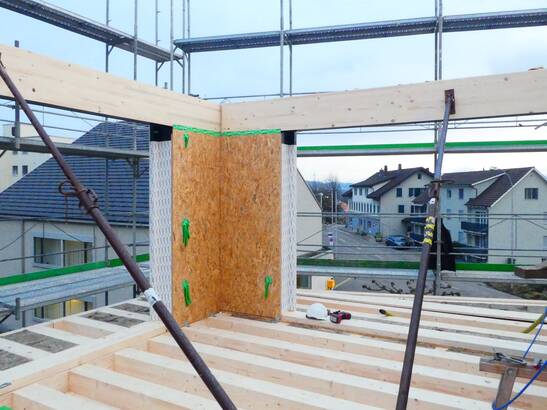 Im Dorfzentrum von Gretzenbach im Kanton Solothurn entsteht ein Holzbau mit zwölf Wohnungen und einem Dorfladen. Die Balkone kragen über 3.5 Meter aus – ohne störende Stützen. Eine ausgeklügelte aufgehängte Konstruktion macht es möglich.