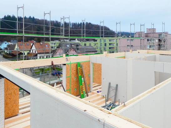 Der Neubau an der Köllikerstrasse 29 in Gretzenbach besteht aus vier Vollgeschossen und einem Untergeschoss. Im Erdgeschoss entstehen Ladenflächen und ein Gemeinschaftraum, darüber werden Wohnungen gebaut. Über dem Untergeschoss ist eine betonierte Abfangdecke, auf der das Gebäude in Holzrahmenbauweise steht. Das massive Treppenhaus und ausgewählte Innenwände sind für die Gebäudeaussteifung verantwortlich.