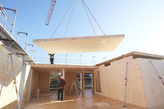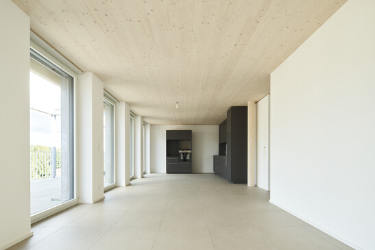 Einst war das Bauwerk als Massivbau geplant, dann konnte Andreas Scherrer von schererarchitekten ag die Bauherrschaft von einem Holzbau mit der TS3-Technologie überzeugen. Während der Überzeugungsphase musste er das Bauprojekt in verschiedenen Materialvarianten weiterplanen. Da spielte ihm TS3 in die Hände. Denn: Die Planung mit den zweiachsig tragenden Brettsperrholzplatten ist ähnlich wie bei Projekten aus Stahlbeton. Aber die Umwelt freut es: Mit dem Systemwechsel von Beton auf Holz konnten beim Fasanenhof 536 Tonnen CO₂ eingespart werden. Das ist ein wichtiger Beitrag zum Klimaschutz.
