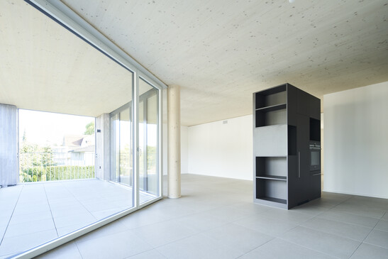 Wärmebrücken einfach gemacht. Wegen der tiefen Wärmeleitfähigkeit von Holz, braucht es keine aufwändigen Kragplattenanschlüsse. Die CLT-Decke läuft von der Wohnung zur Loggia einfach durch.