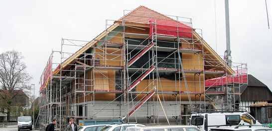 Beim Auspacken des Wohnteils wurde dann festgestellt, dass das Tragwerk nicht mehr funktionstüchtig ist. So wurde auch dieser Teil bis auf die Decke über dem EG rück- und in Holz-Elementbauweise neu aufgebaut. Als besondere Herausforderung galt es, die neu zu erstellenden Teile als Elementbau in die zum Teil uneben verlaufenden bestehenden Teile einzufügen. Im neu erstellten Gebäude wurden 5 Wohnungen mit je 4 ½ Zimmern erstellt.