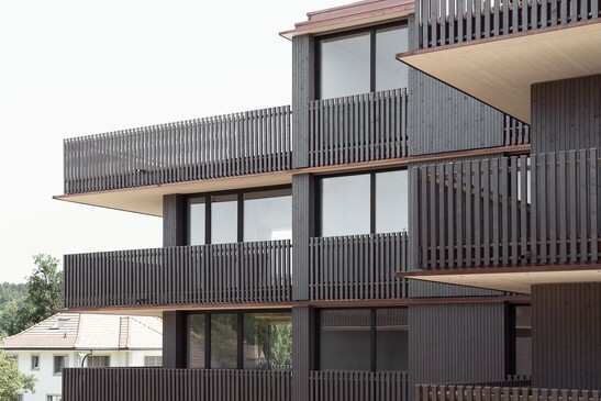 Die TS3-Verbindung mittels Fugenverguss ermöglicht den Bau von unterzugsfreien Skelettbaustrukturen aus Holz mit schlanken, punktgestützten Platten. Durch Aktivierung der sekundären Tragrichtung können mit Holz die gleichen Decken gebaut werden. Wegen der tiefen Wärmeleitfähigkeit von Holz, braucht es keine aufwändigen Kragplattenanschlüsse. Die CLT-Platte kann einfach vom Innen- in den Aussenbereich laufen. Das betonierte Treppenhaus steift das Gebäude aus.