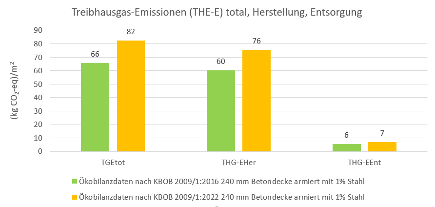 Avec les anciennes données on a calculé une dalle en béton d'un mètre carré, de 240 millimètres d'épaisseur, avec une d'armature de 1%, c'est-à-dire une exécution courante et fréquente de murs de soutènement. d'étages bétonnés, était chiffrée à 104'159 points de charge environnementale. Nouveau ce chiffre est passé à 137'308, soit une augmentation de 32%. La situation est similaire pour les l'énergie primaire et les émissions de gaz à effet de serre - et le béton est un puits de CO₂. béton n'est pas.