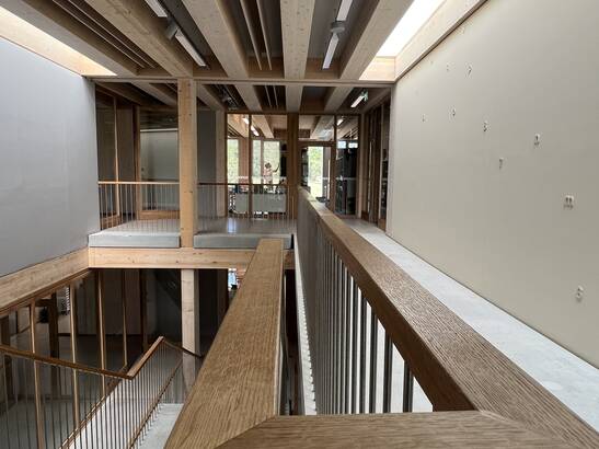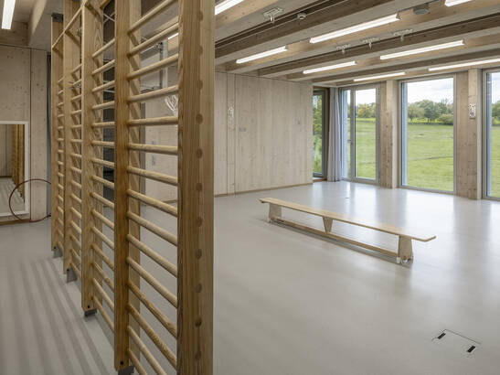 La nouvelle école combine la construction en bois massif et la construction à ossature habilement : Tous les planchers et une partie des murs intérieurs pour le contreventement du bâtiment sont construits en bois massif de bois lamellé-collé. Les autres murs intérieurs sont des cadres non porteurs. constructions à ossature. Les surfaces chaudes des murs et des plafonds en bois, ainsi que le l'échange permanent entre le bois et l'humidité de l'air créent un bon climat intérieur. climat intérieur. Des murs bien isolés sont importants : en effet, plus la différence entre la température de surface des murs, des sols et des plafonds et celle de l'air ambiant. température de l'air, plus il fait bon vivre dans une pièce. C'est pourquoi nous nous sentons dans les bâtiments en bois bien isolés, même lorsque la température est un peu plus basse. température ambiante. Les bâtiments peuvent ainsi être exploités de manière plus économe en énergie. De plus, la température Le bois donne l'impression d'avoir une température de surface plus élevée que le béton, l'acier ou le verre, ce qui Le bien-être est encore plus grand.