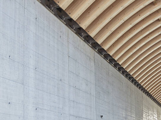 Les 156 poutres en arc en bois lamellé-collé d'une section de 240 x 760 millimètres et les murs en béton jouent ensemble : les forces latérales exercées sur les murs en béton sont absorbées par la construction en bois en forme d'arc. Les fermes en arc s'appuient à leur tour horizontalement et verticalement sur les murs en béton. Des articulations en acier relient les fermes en bois aux murs en béton coulé sur place de 80 centimètres d'épaisseur. Les propriétés de soutien du sol ont été modélisées avec des appuis à ressort et des constantes de ressort calculées.