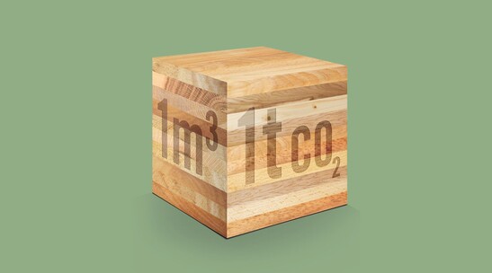 Selon la liste KBOB des données d'écobilan, un kilogramme de bois d'épicéa contient 0,451 kg de carbone biogène. Avec une densité brute de 485 kg/m3, cela fait 1075 kg de carbone biogène par mètre cube de bois. En règle générale, chaque mètre cube de bois stocke une tonne de CO₂. En contrepartie, la production d'un mètre cube de béton génère une demi-tonne de CO₂.