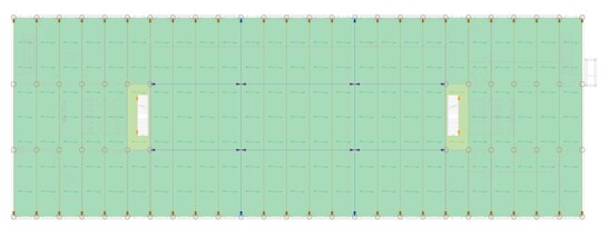 La structure primaire (en bleu) enjambe le gymnase sur une largeur de gymnase d'une largeur d'environ 33 mètres.
