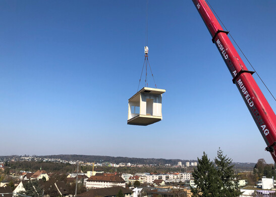 Pendant plusieurs semaines semaines, les charpentiers de Stamm Bau AG ont fabriqué 28 modules en bois. Ils peuvent être fabriqués dans le hall d'usine - une précision qui ne serait pas possible sur le chantier. Une précision qui ne serait pas possible sur le chantier. En une journée, la grue hisse tous les modules à des hauteurs élevées. à des hauteurs élevées. Sur le toit plat de l'aile ouest existante, les ouvriers montent les modules. les modules en bois. Ils créent ainsi de la place pour de nouveaux bureaux dans l'hôpital. l'hôpital de Dornach.