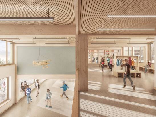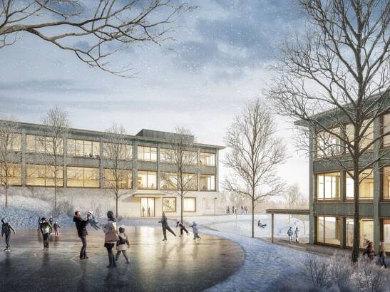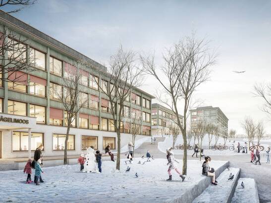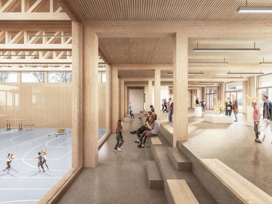 Trois bâtiments scolaires allongés et un bâtiment central marquant avec un gymnase double et un bâtiment de tête annexe forment ensemble l'ensemble scolaire du "Projet Nägelimoos" à Kloten. Des colombages imposants en épicéa et en hêtre posent des accents architecturaux sur la construction du plafond du gymnase. Une construction en bois de tous les superlatifs.