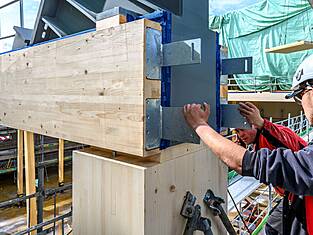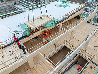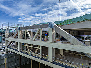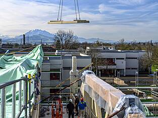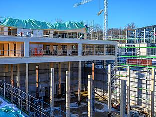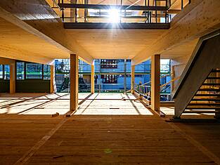 Le bâtiment principal Est mesure 97 mètres de long et environ 35 mètres de large. Actuellement, les programmes des bâtiments sont en cours d'érection. Les deux sous-sols en béton armé abritent les installations techniques, une salle de sport et le parking souterrain. Au-dessus, trois étages en bois sont destinés aux activités scolaires. Au-dessus du gymnase triple, une structure en treillis de deux étages (primaire et secondaire) servira de structure porteuse et sera, de par sa forme, l'une des plus grandes structures en treillis en bois jamais construites en Suisse. Longueur : 33,36 m, hauteur : environ 8 m. Des forces allant jusqu'à 1300 tonnes s'exercent sur la diagonale du treillis. Les équipes de professionnels de la construction en bois de BISANG Holzbau AG et de Kost Holzbau und Gesamtbau ont transformé plus de 2'500 m³ de bois en seulement six mois. En plus de la haute technologie de la construction, il s'agit d'un engagement fort en faveur de la construction durable en bois. C'est ainsi que fonctionne la protection active du climat.