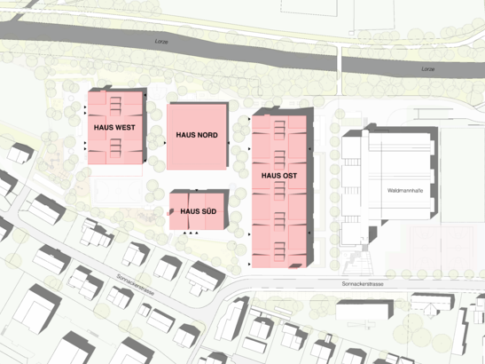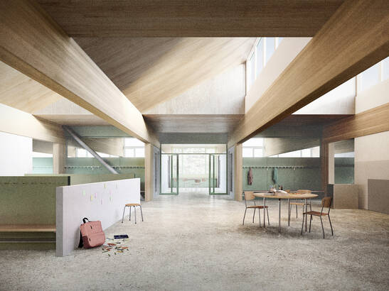 Le projet gagnant «Domino» du bureau d'architectes PENZISBETTINI. Architekten ETH/SIA GmbH, Zurich, se compose de quatre bâtiments. Le bâtiment principal, la maison Est, abrite les salles de classe des niveaux secondaires I et II ainsi que la salle de gymnastique triple. La maison Ouest comprend les jardins d'enfants et le premier cycle. La maison Nord comprend l'aula, la bibliothèque et l'informatique, tandis que la maison Sud abrite l'accueil parascolaire et le logement du concierge.