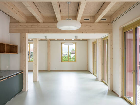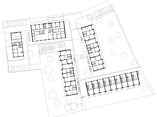 Le projet comprend 2 immeubles collectifs, 9 maisons individuelles en rangée, 1 centre de santé et une bibliothèque avec salle polyvalente. L'intégration dans l'environnement rural a été parfaitement réussie grâce aux coursives, aux toits en pente ainsi qu'aux façades en bois. Les quatre nouveaux bâtiments ont été entièrement construits en bois à partir de la dalle de fondation. L'offre de location a été largement utilisée. Toutes les unités d'habitation sont louées.