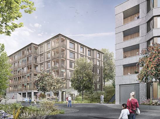 Une attention particulière est accordée à une conception adaptée au lieu et au voisinage ainsi qu'à une architecture de qualité. Les espaces intérieurs et les façades doivent convaincre par une matérialisation de qualité, tandis que le concept de technique du bâtiment mise sur des solutions modernes et durablement efficaces. Dans l'optique d'un mode de construction économique et d'une exploitation rentable, le projet sera réalisé conformément aux normes Minergie®-P-Eco. La compatibilité avec l'extension du parking souterrain du centre pour personnes âgées Du Lac voisin est également prise en compte, afin de garantir la poursuite des travaux de construction sans interruption. L'architecture prévue accorde une grande importance à la mixité des logements et des usages. Les séquences spatiales en structure modulaire comprennent des tailles de logements de 2 ½, 3 ½, 4 ½ et 5 ½.