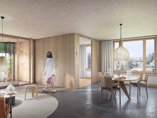 Les planchers sont réalisés en bois lamellé-croisé, les piliers en bois. La technologie TS3 est utilisée dans la trame continue des poteaux et offre une flexibilité maximale dans la conception architecturale des murs intérieurs en construction légère. Le corps de bâtiment de 5 étages enrichira le site Du Lac à St. Moritz sur le plan urbanistique grâce à l'utilisation d'une façade en bois avec une structure verticale et horizontale. La planification de l'ouvrage ainsi que la préfabrication doivent avoir lieu d'avril à août 2025, de sorte que la construction en bois puisse être érigée aux mois de septembre et octobre 2025.