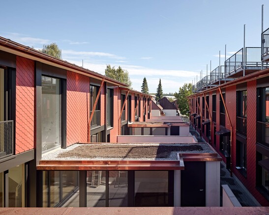 Nous nous sommes occupés de ce lotissement à Rain. Le garage souterrain existant a été suffisamment renforcé pour que les bâtiments de deux étages puissent être construits au-dessus. Au-dessus du sol, tout a été construit en bois avec des plafonds en bois visibles. Il a fallu tenir compte de la physique du bâtiment en raison de la présence d'une route principale très fréquentée.