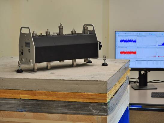 Pour nos clients, nous testons dans notre banc d'essai de bruits d'impact des structures de sol innovantes avec des mesures comparatives. Le banc d'essai des bruits d'impact est le résultat de plusieurs travaux de bachelor à la Haute école spécialisée bernoise de Bienne.