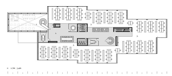 The clear room layout is ideally suited for a timber construction: the central The central concrete core grounds the entire building and assumes a bracing function. The walls and ceilings of the workspaces are made of wood.