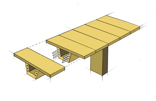 The TS3 long-term test stand at the Bern University of Applied Sciences has delivered important results for the successful development of TS3 technology and has helped the technology to achieve market breakthrough. It has now been dismantled. In keeping with the circular economy, a new object is being created from the cross-laminated timber boards: two box girder elements for heavy-duty bridges.