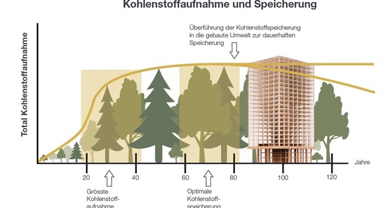 At around 30 years, a tree has the most efficient carbon uptake, because this is the time when it grows the most. After about 50 years is the ideal time for its felling and material use. This allows the stored carbon to be transferred to the built environment and stored for the long term. And there is room for young trees in the forest.