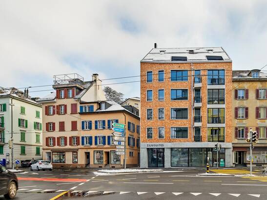 The Liv Suites in the seven-story wooden building in the heart of the city of Lucerne offer a modern living experience. The shingle facade is an eye-catcher. Fire tests allow the continuous larch cladding without disturbing aprons or fire bars.