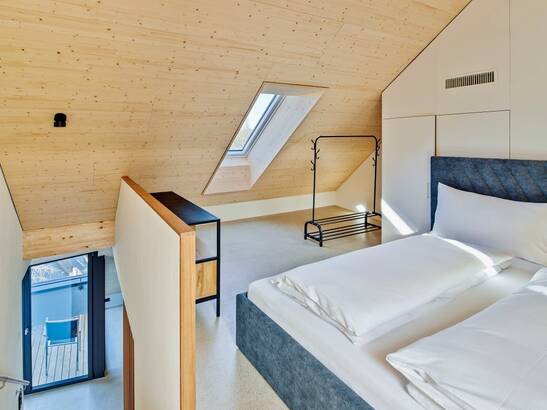 Now the seven-story wooden building is completed and the larch shingle facade shines with its golden yellow color. Soon it will take on a silver-gray patina and is very durable thanks to the natural resins and ingredients. The facade does not require maintenance or painting and has a service life of up to 80 years.