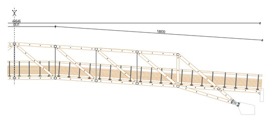 absorb the tensile forces. The steel parts in the nodes allow a very high degree of prefabrication of the bridge and rapid assembly on site. The wood for the bridge was felled by foresters last