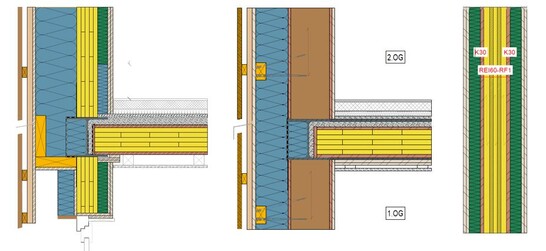 Three details from the building F. Left: The supporting structure and the floor slab are designed as encapsulated components. The sound insulation is ensured by elastically bonded fill. This means that concrete can be completely dispensed with. Center: The encapsulated supports rest on a steel girder. This supports the encapsulated floor slab. This allows all exterior and interior walls to be non-load-bearing. walls can be non-load-bearing. Right: The elevator shaft of the four-story building is also a wooden construction. wooden construction.