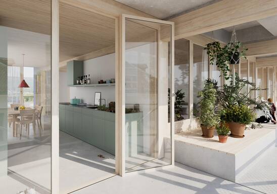 The winning project proposes a reinterpretation of the farm building with its implied industrial or workshop character in a grid-like timber construction. The compact yet light-looking volume stands parallel to the Sauerländerhaus and responds with a staggered structure to the north. It is deliberately the same height as the eaves of the Sauerländerhaus and preserves sufficient space towards the neighboring Laurenzenvorstadt 95. According to the assessment panel, this allows a harmonious ensemble to be created on the Sauerländer site, including a park-like garden with biodiverse planting in front. The forecourt with its historic paving, which was originally used as a farmyard, is to remain a lively meeting place with a public character and its function is to be further strengthened. Among other things, the parking spaces will be relocated to a parking garage. In addition to the unchanged commercial use of the Sauerländerhaus and, for example, coworking spaces, yoga studios or residential studios on the first floor of the new building, the current cinema could also continue to exist here and provide life.