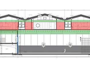 Vierendeel girders were used on this basis to support the roof loads on the school floor - a truss construction without diagonal struts that allows large openings with a high degree of rigidity. The beams were arranged in a grid of 7 to 8 meters and allow for spacious, column-free rooms.