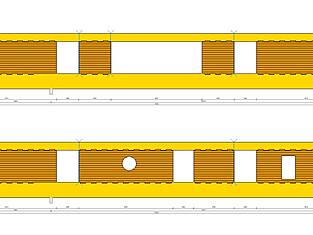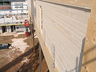 The connection between the CLT walls and the timber chords is made via so-called shear cams, which are milled directly out of the cross laminated timber in the longitudinal direction. These cams transfer the shear forces positively into the load-bearing system. The performance of these cams has been impressively demonstrated by extensive tests at ETH Zurich: A single cam can absorb shear forces of up to 30 tons.