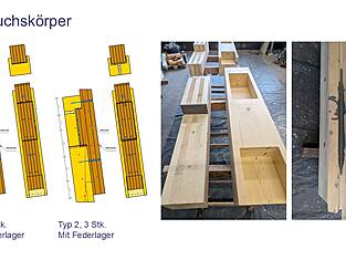 The beams are made entirely of wood: the upper and lower chords are made of spruce glulam, while the vertical filler elements are made of spruce cross laminated timber (CLT). The latter act as shear plates that transfer the horizontal force between the chords. In order for the system to function as a unit, a high-performance connection was required - and this is where the real engineering skill of this project lies.