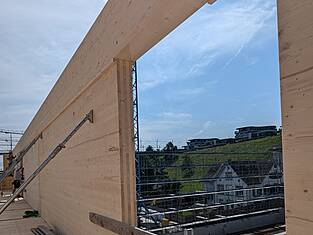 Precisely planned, this connection solution enables a very high load-bearing capacity. The glulam beams were manufactured in the factory at Hüsser Holzleimbau AG, Bremgarten, and then installed on site in combination with the CLT panels. The precisely prefabricated components can be quickly installed on site. This significantly reduces the construction time.