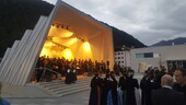 In Kirchdorf, the music pavilion is the last building block of the new educational campus. It is a free-standing solitaire visible from all sides with the stage to the south and a bus stop for the school bus to the north.The folding structure of solid wooden panels was developed from its acoustic requirements. On the one hand, the sound should be directed to the audience, on the other hand, the musicians have to hear each other in order to play together.