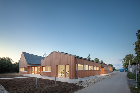 Due to the short construction time, the buildings were largely realized using a resource-saving timber frame construction method. Matching the roofs of the existing buildings, a rafter roof construction was used for the training building and the day group building. The roof construction of the residential group was realized with cross laminated timber elements. The exercise room, which forms part of the training building, was constructed with a frame structure. The decisive factor here was the somewhat higher spans due to the open, column-free floor plan area.