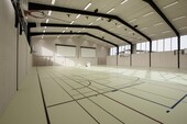 The wall panels as well as the roof were made of prefabricated elements with 3-layer panels of spruce wood, which are perforated to improve the acoustics. The atmosphere of the multi-purpose hall is characterised by the warm colour of the wood. The new windows created interesting diagonal views and spatial references.