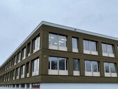 A nearby timber construction company precisely prefabricated the facade elements using timber frame construction. A mobile crane lifted the exterior wall elements between the facade scaffolding and the building structure. These were attached to the building shell. The chosen construction method allowed the building envelope to be closed quickly, enabling an early start to the interior work. The final assembly step was the installation of the facade cladding.