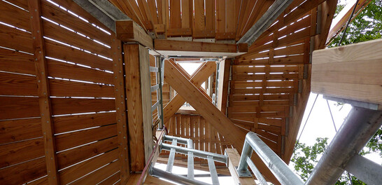 The inner posts, stringers and railings are supported by steel brackets, which allowed for a rather filigree construction. Bracing against external forces such as wind is provided by a tension rod system. The viewing platform is covered by a hipped roof made of hollow box elements.