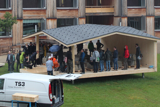 Der gestern eingeweihte Dauerprüfstand hat den Zweck, im Rahmen der Entwicklungsprüfungen die möglichen Anwendungen des TS3-Systems zu prüfen und zu demonstrieren. Der Prüfstand wurde in den letzten Wochen im Innenhof des BFH-Departements Architektur, Holz und Bau (AHB) in Biel errichtet und am Mittwochabend offiziell eingeweiht.