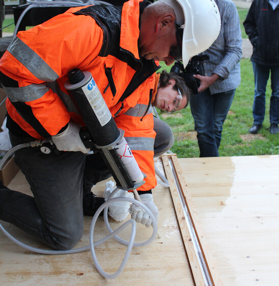Nach den Ansprachen von TS3-Geschäftsführer Stefan Zöllig und BFH-Professor Steffen Franke wurden die Anwesenden Zeugen davon, wie der weltweit erste Holzbalkon stirnseitig verklebt wurde.