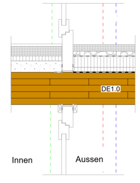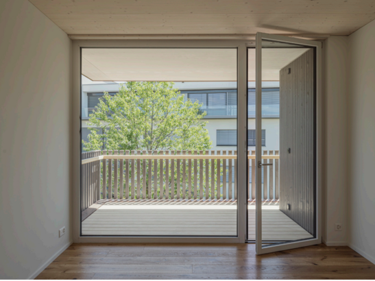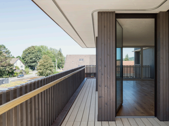 Wärmebrücken einfach gemacht. Wegen der tiefen Wärmeleitfähigkeit von Holz, braucht es keine aufwändigen Kragplattenanschlüsse. Die CLT-Decke läuft von der Wohnung zur Loggia einfach durch. Diese Konstruktionsweise ermöglicht die Stützen-Platten-Konstruktion von TS3 und den nicht tragenden Aussenwänden.