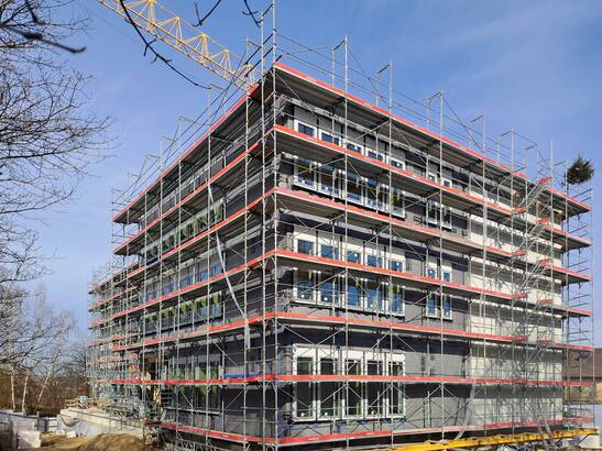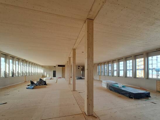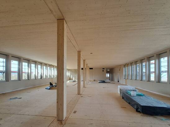 Timbatec hat langjährige Erfahrung in der Planung von Bürobauten. Hier geben wir Einblicke in kürzlich realisierte Bürobauten und Geschäftsliegenschaften. Ein aktuelles Beispiel ist das multifunktionale Laborgebäude auf dem Campus Irchel der Universität Zürich. Im Neubau sind neben Büro-, Lager-, Technik- und Infrastrukturräumen vor allem hochinstallierte Laborflächen auf insgesamt 2’450 m² vorgesehen. Auf dem zweigeschossigen Massivbau wurde kürzlich der dreigeschossige Holzbaukomplex mit 3.8 Meter hohen Räumen fertig aufgerichtet.