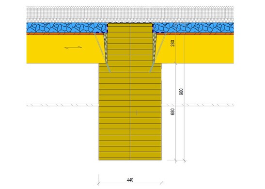 Ein verleimter Brettschichtholzträger aus Schweizer Buchenholz überspannt die Räume. Er leitet die Lasten aus den Obergeschossen in die Aussenwände. Der Träger hat eine Abmessung von 96x44cm. Dank geschickter Konstruktion und herabhängter Decke sind schlussendlich nur noch knapp 40 Zentimeter des Trägers sichtbar.