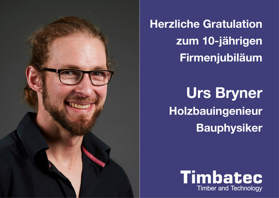 Herzliche Gratulation zum 10-jährigen Firmenjubiläum. Urs Bryner, Holzbauingenieur und Bauphysiker. Alle Teammitglieder der Timbatec-Familie sind stolz auf dich und bedanken sich für die Zusammenarbeit.