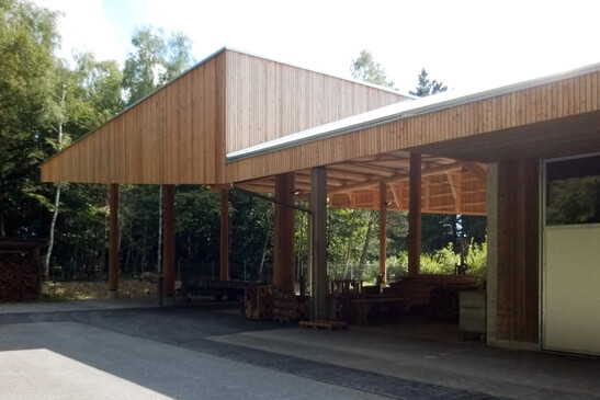 In den Gemeindewäldern wächst auch Holz das sich ideal zum Bauen eignet. So baute die Forstverwaltung das neue Brennholzlager komplett aus Holz aus dem Forstrevier. Die Tragstruktur ist aus Rundholz erstellt und besteht aus neun ganzen Douglasien-Stämmen. Diese Stämme wurden speziell zu diesem Zweck im Wald ausgesucht und geschlagen.