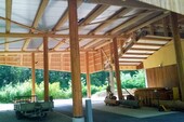 Mit dieser Konstruktion kommt der 16 x 21 Meter grosse Unterstand ohne weitere Aussteifungselemente wie Streben oder Bögen aus. Die spannende Konstruktion mit Douglasien aus den eigenen Wäldern wurde mit dem Holzpreis 2017 ausgezeichnet.