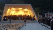 In Kirchdorf ist der Musikpavillon der letzte Baustein des neuen Bildungscampus. Er ist ein frei stehender und von allen Seiten sichtbarer Solitär mit der Bühne nach Süden und einer Bushaltestelle für den Schülerbus nach Norden.Das Faltwerk aus massiven Holzplatten wurde aus seinen akustischen Erfordernissen heraus entwickelt. Der Schall soll einerseits zum Publikum geleitet werden, andererseits müssen sich die Musiker gegenseitig hören, um zusammen spielen zu können.